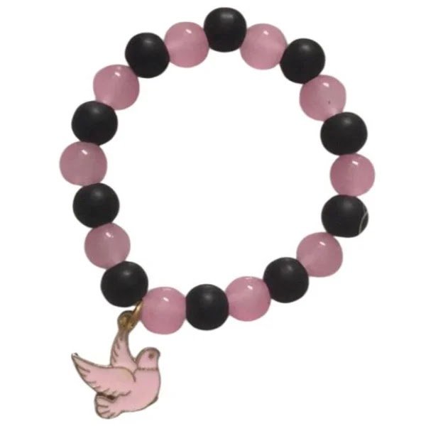 Make a statement with our Peace Bracelet , featuring a striking blend of pink and black beads arranged in a bold alternating pattern. At the heart of this piece is a pink bird-shaped charm, detailed with shimmering gold accents—adding a playful yet graceful touch. Perfect for someone who loves unique style with a pop of personality.